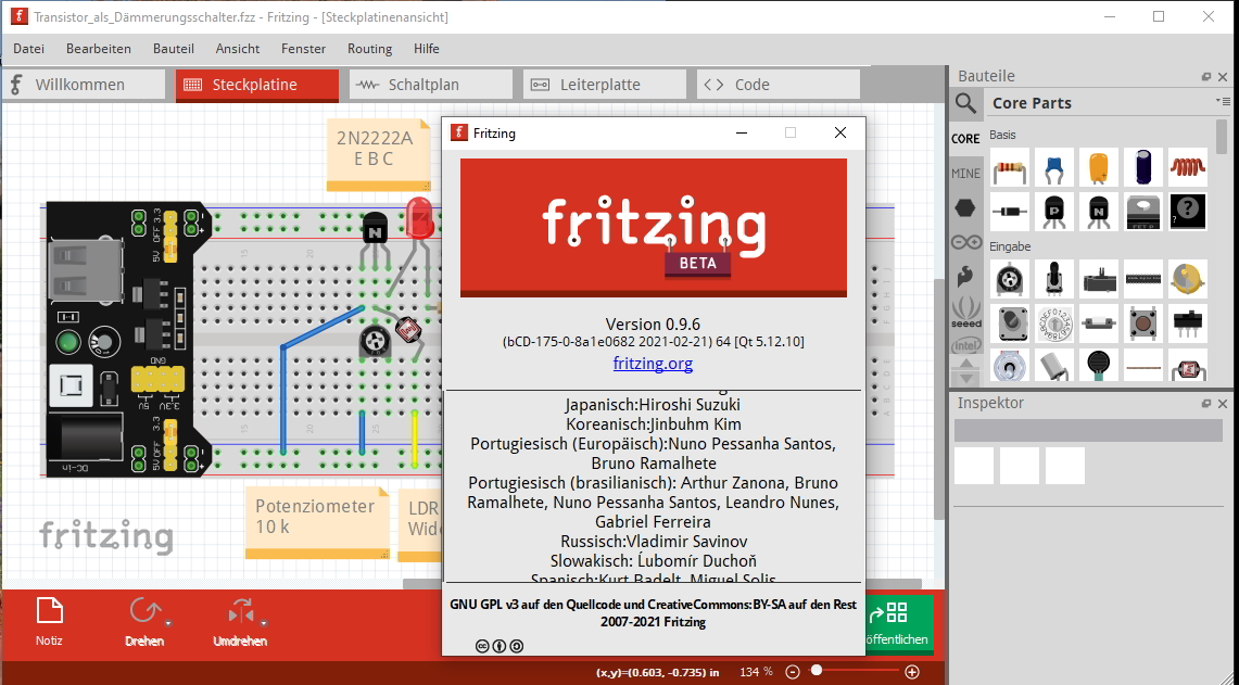 Was mit einem 2N2222A, lichtabhängigen Widerstand und Potenziometer aus einem der vielen Starterkits für den Arduino so einfach gemacht ist, soll einem Freund „mal eben“ zum Nachbau gezeigt werden. Corona lässt Besuche nicht so einfach zu. Ein Foto (siehe oben) ist flott gemacht. Es kommen die unvermeidlichen Fragen: „Wo steckt …? Wie hast Du …?“. „Bitteeee kein Schaltplan!“ tönt es in der Miniwebkonferenz von der anderen Seite. Klar, ich bin grausam. Schaltplan ist unvermeidlich – aber nicht immer hilfreich für Neulinge. Um den Frust nicht zu vergrößern gibt es glücklicherweise ein einfaches Tools für die Visualisierung von Steckbrettaufbauten. Fritzing!
